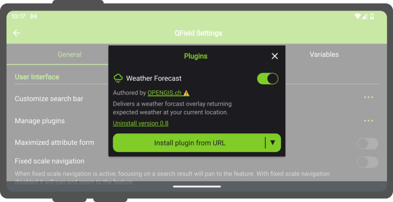 In QField, open the plugins manager popup found in the settings panel, and use the ‘Install plugin from URL’ button to paste a URL pointing to a zipped plugin file.