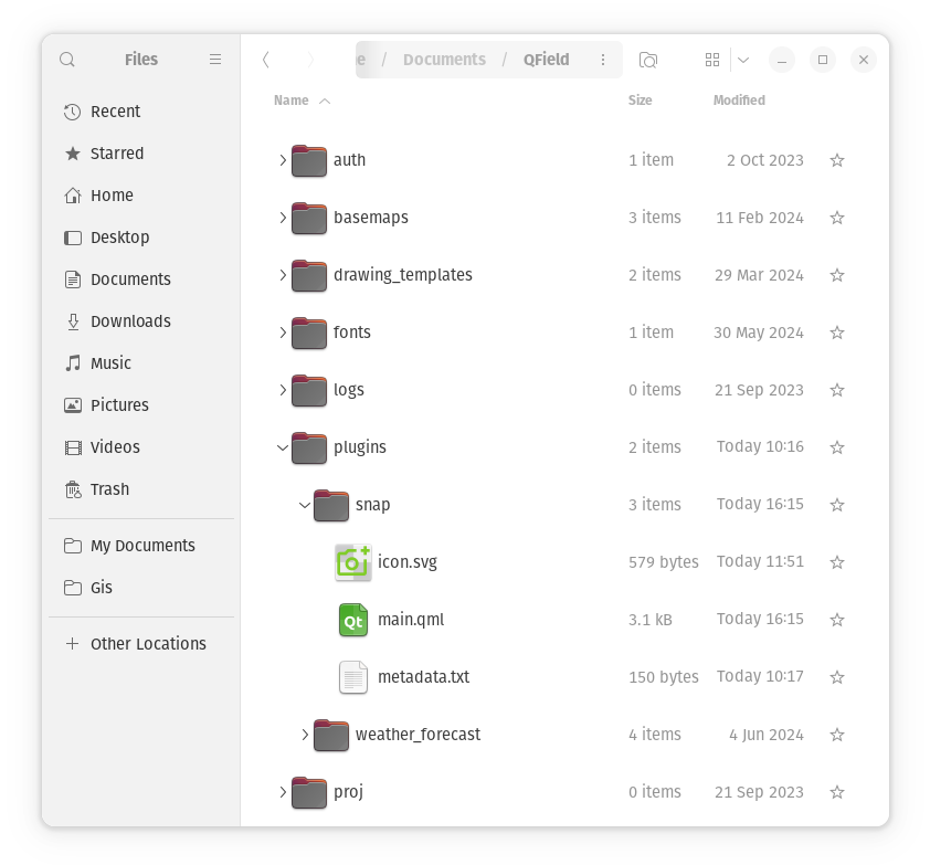 As seen in the screenshot above, which demonstrates the directory hierarchy, a given plugin directory must contain at least two files: a main.qml file, which QField will use to activate the plugin, and a metadata.txt file containing basic information on the plugin, such as the plugin name, author details, and version.