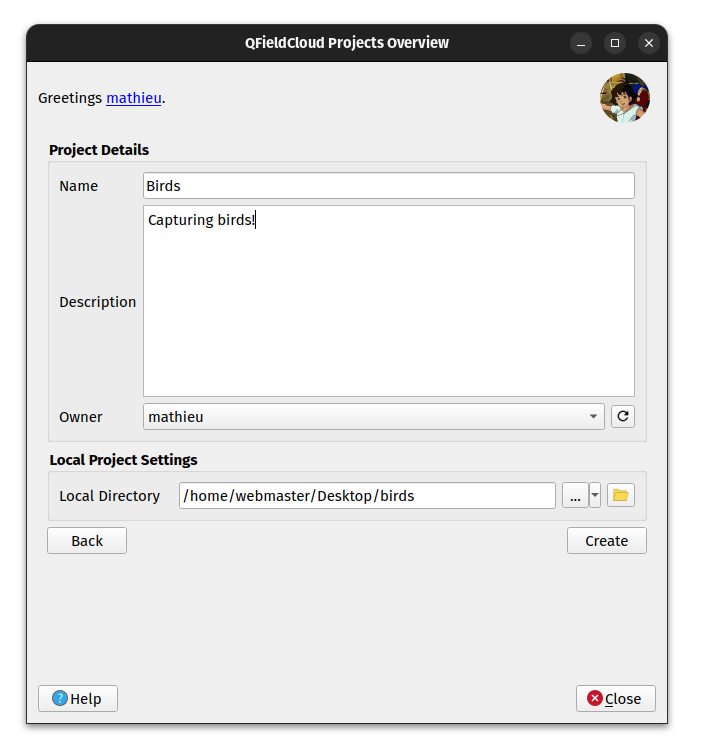 In the subsequent panel dialog, choose the ‘Create a new empty QFieldCloud project’ and then hit the ‘Next’ button. Give it a name and a description, and for the local directory, pick the folder within which you had extracted the birdwatcher project, then hit the ‘Create’ button.