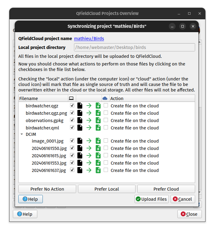 QFieldSync will then ask you to upload your newly created cloud project environment to the server. Notice how the project plugin file (birdwatcher.qml) is part of the files to be delivered to the cloud. Confirm by clicking on the ‘Upload to server’ button.